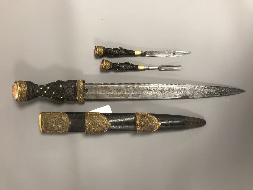 Minor blade corrosions, the gilt brass tip of scabbard missing and perhaps four brass studs to the reverse of the pommell.