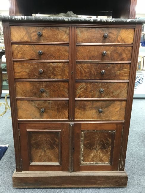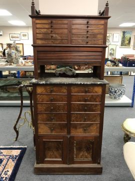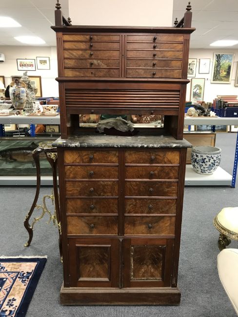 A late Victorian multi drawer horologist's cabinet with shutter front above marble work stand, width 71.5 cm.