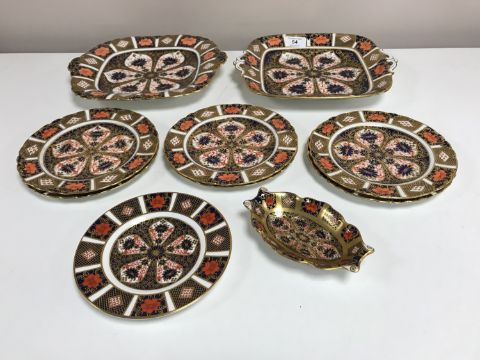 Ten pieces of Royal Crown Derby, to include a pair of square side plates, six side plates, diameter 18 cm, all pattern 1206, a small side plate and an oblong pin dish, both pattern 1128. (10)