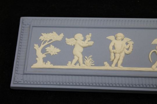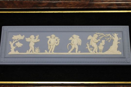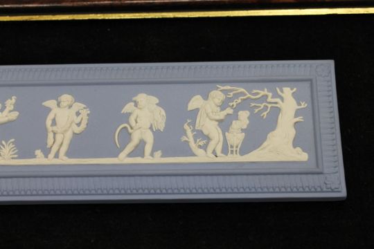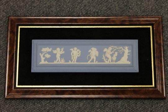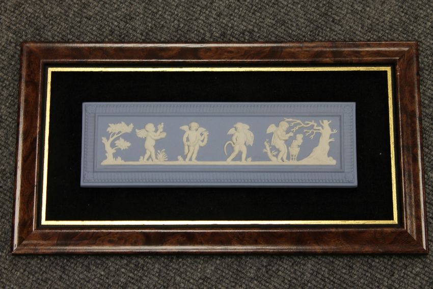 A Wedgwood Jasper Ware framed panel depicting cherubs, 34 cm x 19 cm, boxed