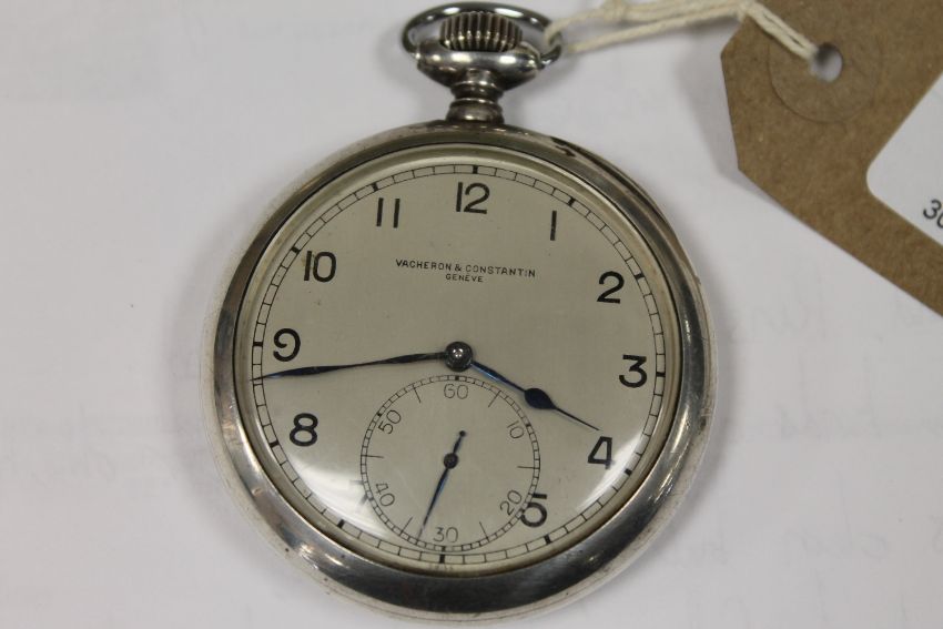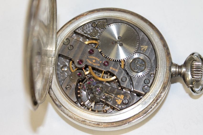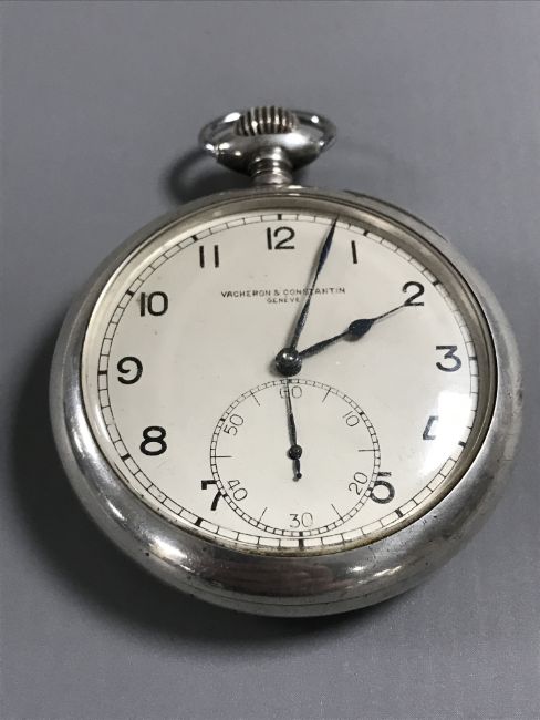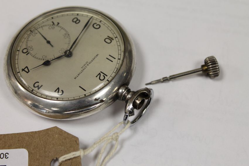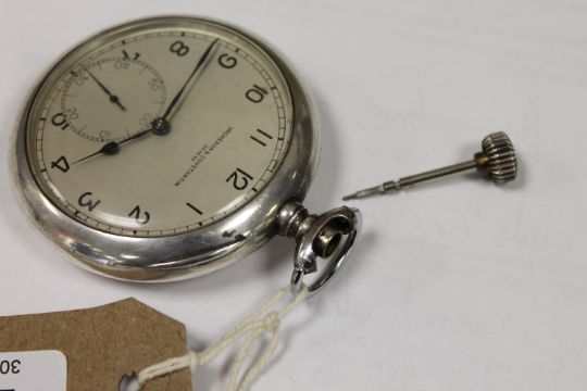 Crown loose and in need of attention. The crown adjusts the watch but will not wind it. Case 60mm. Silvered dial slightly tarnished. Watch not running. Case in good condition. Movement numbered 446102. See additional images.