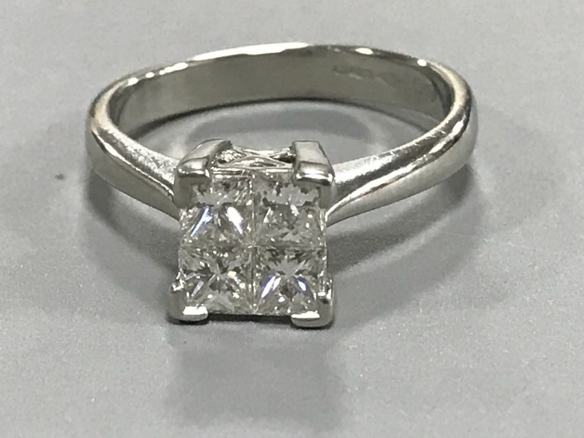 The ring is in good condition. It is stamped '900' for platinum, as well as the maker's mark 'JB'. The approximate qualities of the diamonds are as follows; Colour - H/I. Clarity - ranging from VS1/VVS2. Ring size N. See additional images.
