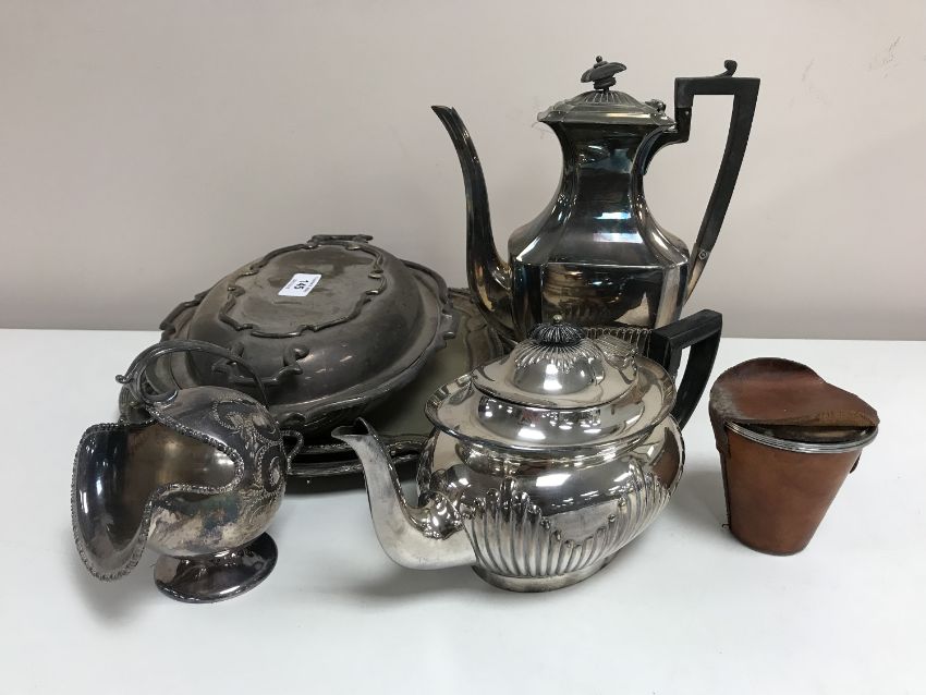 A tray of silver plated trays, breakfast dish, stirrup cups, plated teapot etc. (Q)