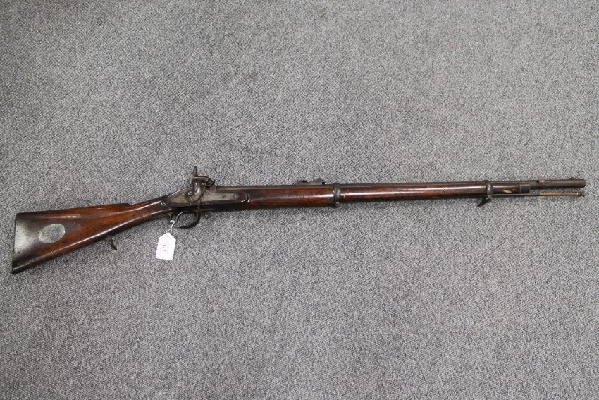 A Victorian 1857 Pattern Percussion Cap Two Band Musket by C. Ingram of Glasgow, with 84cm barrel and ramrod, the walnut stock with inset silver-plated presentation engraving 'Presented by J. Barclay Esq. Won by Mr. James Anderson. 1862'. CONDITION REPORT: Metalwork pitted. Action works well. Scratches and scuffs to walnut. See additional images.