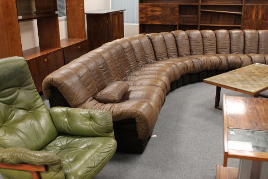 Berger, Heinz and Riva for de Sede - A mid 1970's modular settee, model DS600 'Non Stop', the twenty-five brown leather elements of modular design, approximate total length 600 cm. CONDITION REPORT: Like many luxury leather goods brands, furniture-manufacturing company de Sede started out as a saddle-making atelier. Based in Klingnau—located in northern Switzerland near the German border—the company traces its high-end furniture production back to 1965, when the original family-run business incorporated and began to collaborate with international designers on the creation of handmade, premium-leather-clad chairs, lounges, and sofas. Over the years, de Sede’s product offering has expanded to include tables, beds, and more.*****Condition report - Overall this is in very good condition. It measures 73cm high, with a seat height of 43cm and a depth of 97cm. The leather upholstery has typical faint scuffs/scratches and watermarks, as well as some mildew on the surface. There do not appear to be any rips or tears. The settee is currently in five seperate sections in our saleroom. It is completely modular and numerous pieces of furniture can be arranged by splitting up the seperate parts by removing the bolts. All of the necessary bolts are present although one is a later replacement. The sections are surprisingly lightweight and can be rearranged easily. This is a most-impressive piece of furniture and a very rare find indeed. Please see the extensive additional images which help to show the scale and potential of this wonderful and rare item.