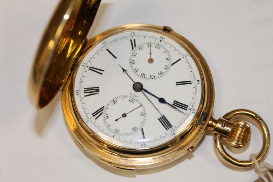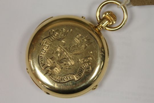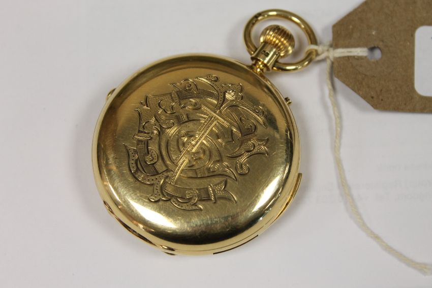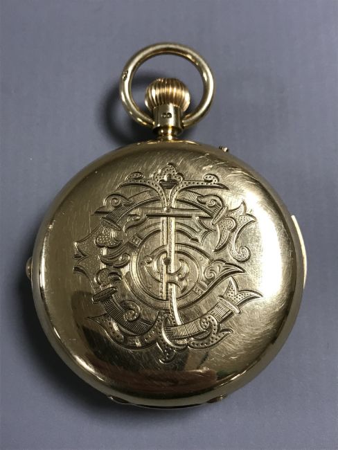 In need of attention. Does not wind. When adjusting, the hands only move very slightly either clockwise or counter-clockwise. Ticks temporarily when shook. The slide repeat cannot be pushed down fully, and therefore does not work. The movement looks clean but obviously requires attention. 56mm case. See additional images.