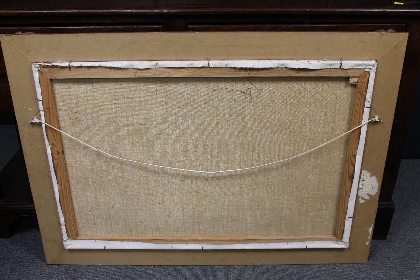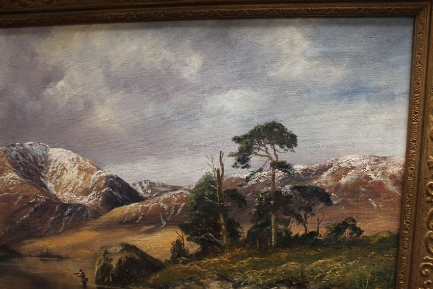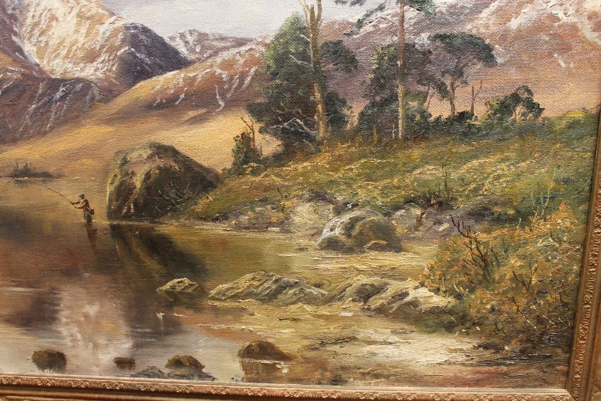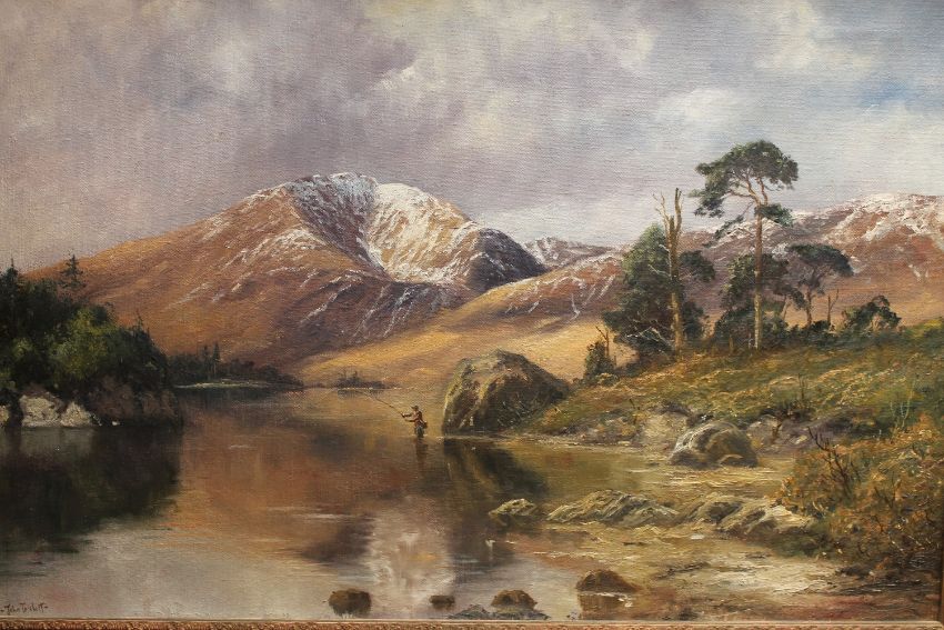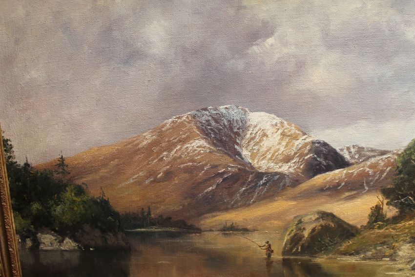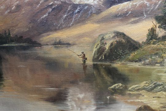 John Trickett : Fly fishing in a shallow river with mountains beyond, oil on canvas, 90 cm x 59 cm, signed, framed.