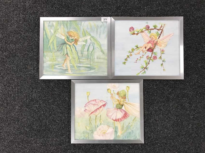 Early Twenty First Century English School : Flower Fairy with Water Lilies, an original illustrator's study in watercolour, signed with the initial "J.E.S.", dated 2000, laid down, 24 cm x 28 cm, together with two similar by the same illustrator both also depicting Flower Fairy subjects, all three parts framed as a set. (3)