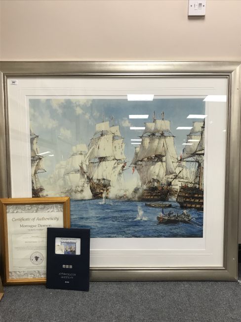 After Montague Dawson : The Battle of Trafalgar, limited edition colour print, produced by Chelsea Green Editions, with certification of authenticity, 93 cm x 80 cm, framed.