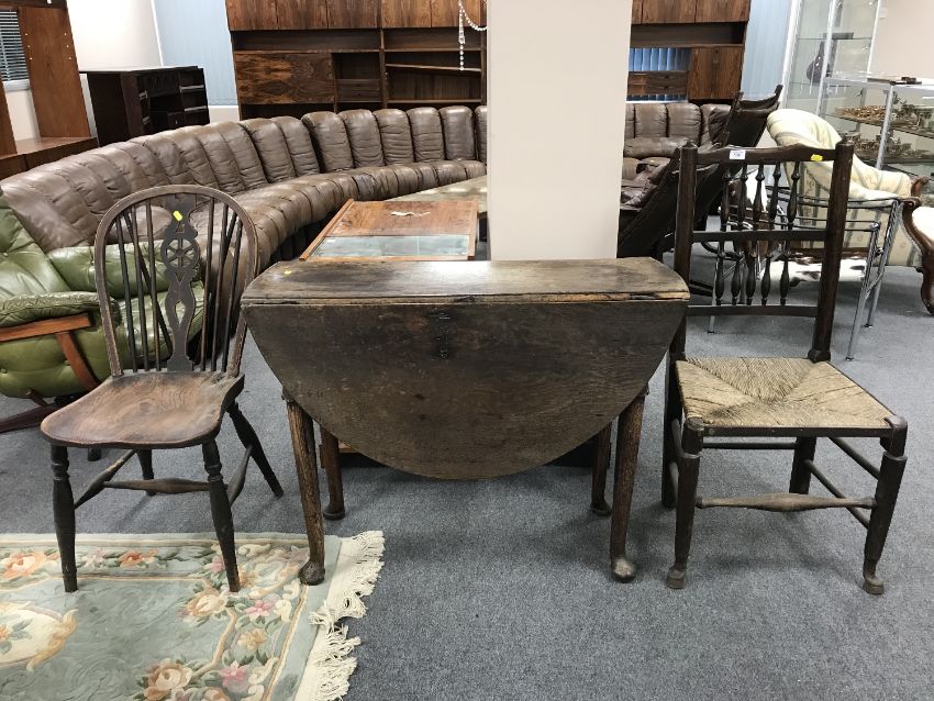 A George III oak gate leg table on pad feet, width 100 cm, together with a rush seated country chair and a single Windsor chair of the same period. (3)