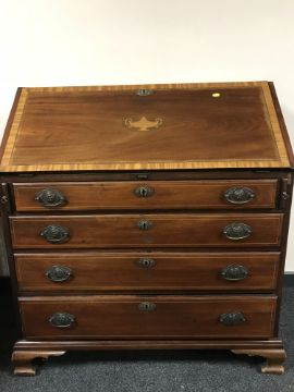 A George III inlaid mahogany bureau on bracket feet, width 97.5 cm.
