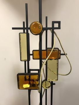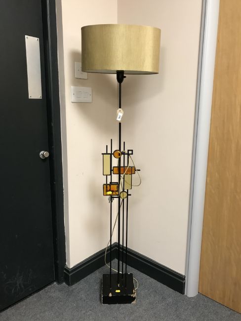 Designed by Svend Aage Holm Sorensen - a rare floor lamp, black iron and lacquered wood with mosaics in amber and yellow glass, 40cm x 26cm x 147cm.