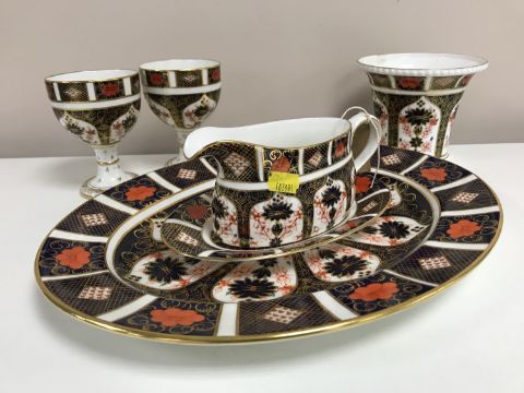 A Royal Crown Derby oval shaped plate, width 37.5 cm, Imari pattern 1128, together with sauce boat on stand, pair of goblets and small vase. (6)
