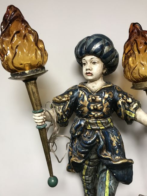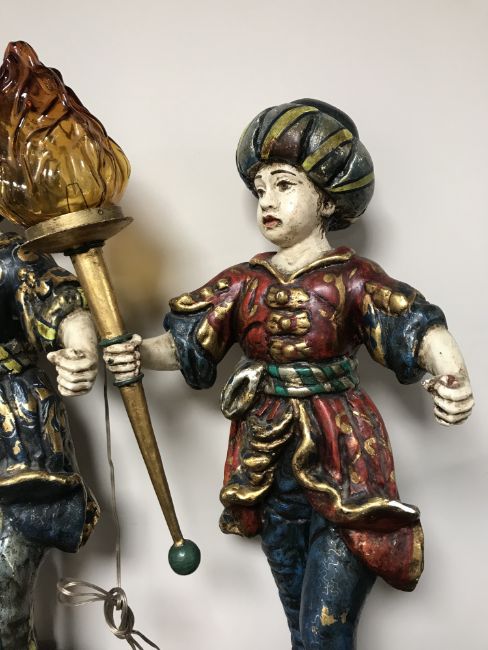 A pair of antique style plaster lamp holders, modelled as jesters, height 76 cm (2)