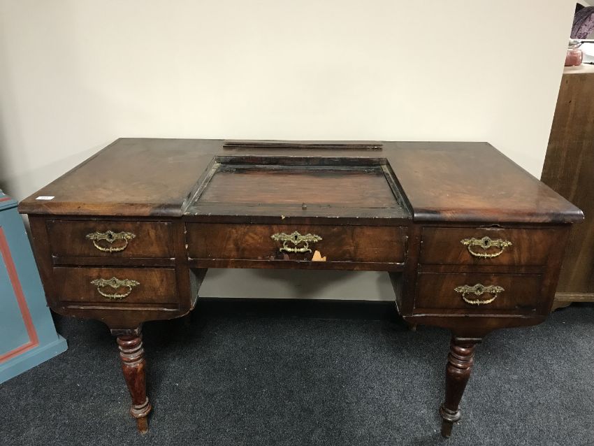 A 19th century mahogany desk fitted with five drawers on turned legs, width 132 cm