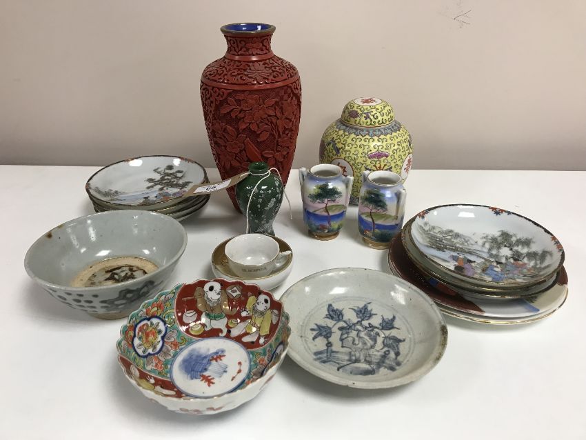 An interesting collection of antique and later Chinese and Japanese ceramics to include Chinese ginger jar, cinnabar vase, antique Chinese stone ware bowl and saucer, Imari dish etc. (q)