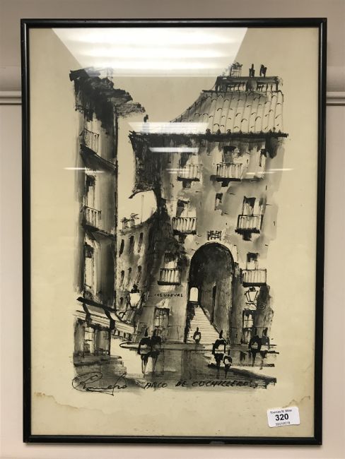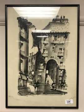 Continental School : Villa in a town square, watercolour, 34 cm x 49 cm, indistinctly signed, framed.