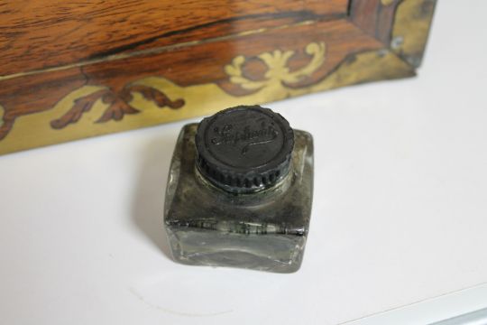 Brass lifting off in certain places. One inkwell present. General surface wear and tear. See additional images.