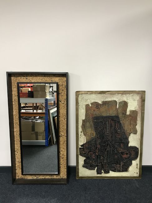 A textured oil mounted on board and an illuminated mirror in cabinet