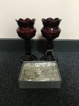A pair of red glass lustre's with drops