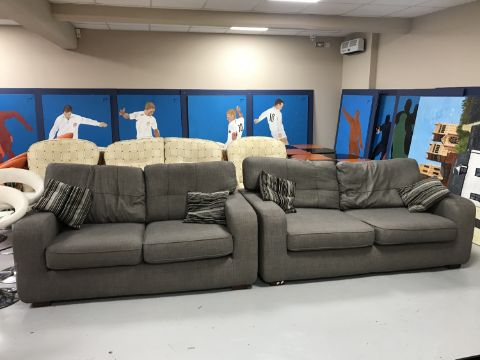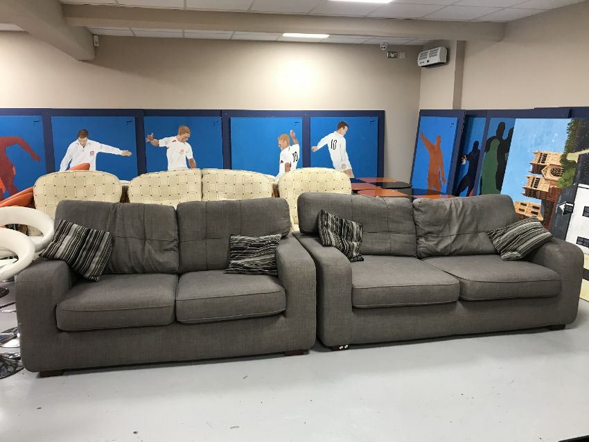 Three seater and two seater settees in contemporary grey cloth fabric with four scatter cushions