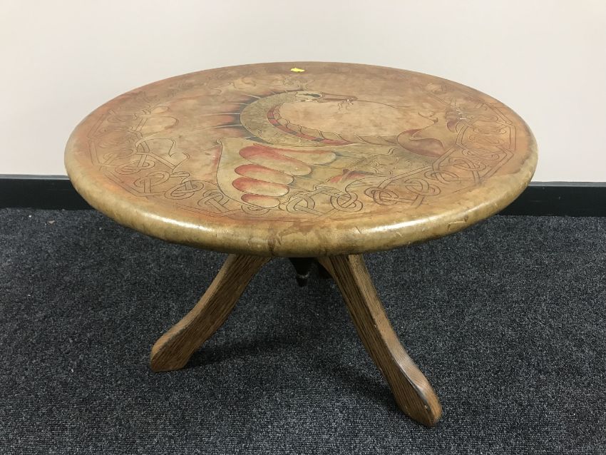 A circular oak pedestal table with a tooled leather top depicting a dragon