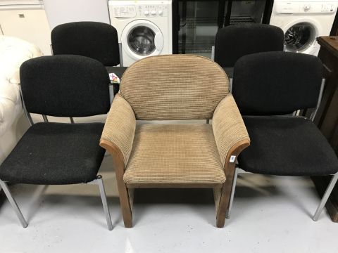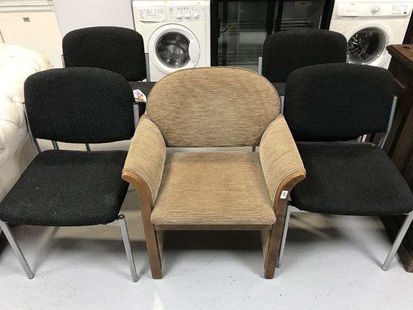 A reception armchair, four stacking armchairs and a pull down screen