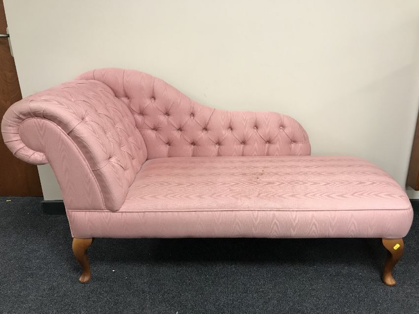 A contemporary chaise longue in pink button fabric