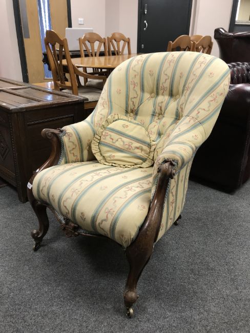 A Victorian carved walnut armchair upholstered in striped fabric, width 58cm