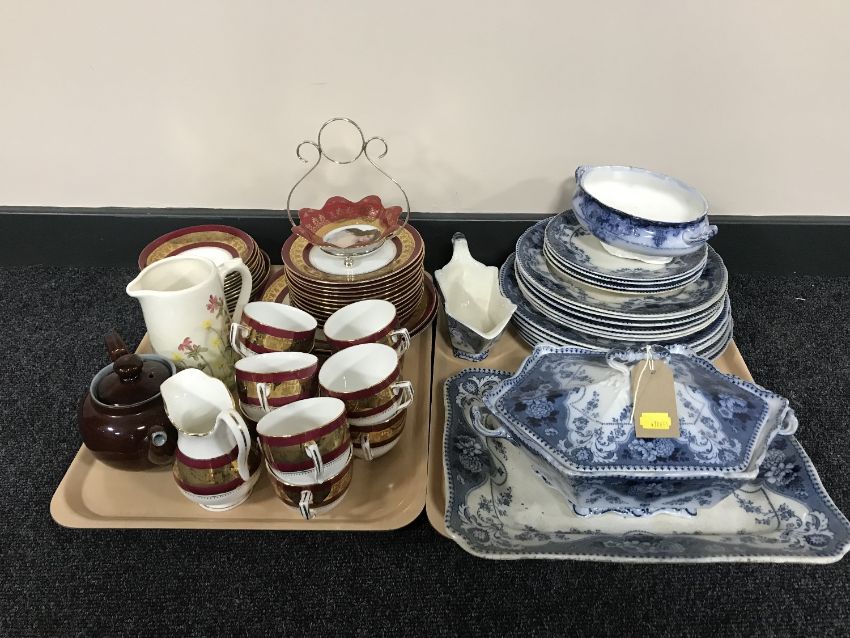 Two trays of antique blue and white dinner ware, tureens, china tea service, Denby stoneware etc