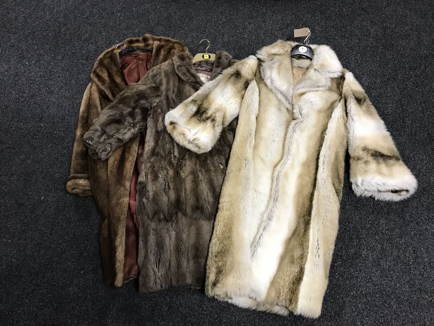 Two lady's fur coats and a simulated fur coats