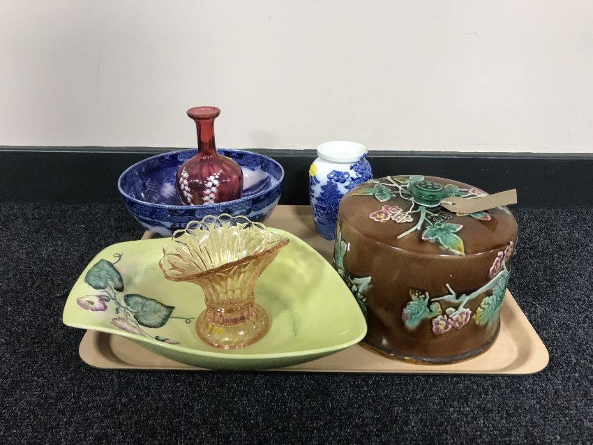 A tray of majolica style cover, Maling blue and white fruit bowl and vase, hand painted cranberry glass vase, Carlton ware dish etc