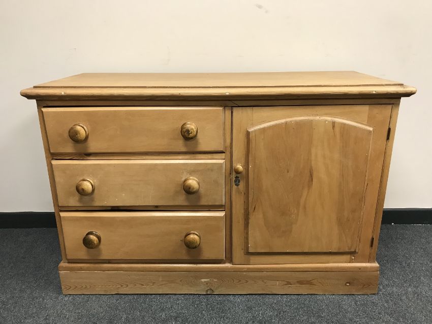 A Victorian pine low cupboard fitted with three drawers, width 122cm