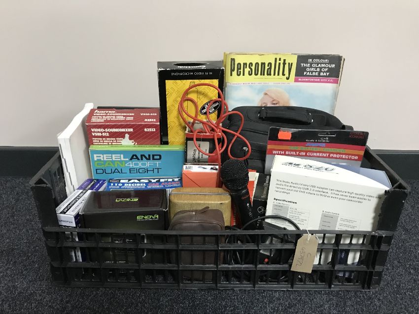 A box of Hammer video sound mixer, microphones, Sony camcorder, cassette to MP3 converter, vintage razor etc