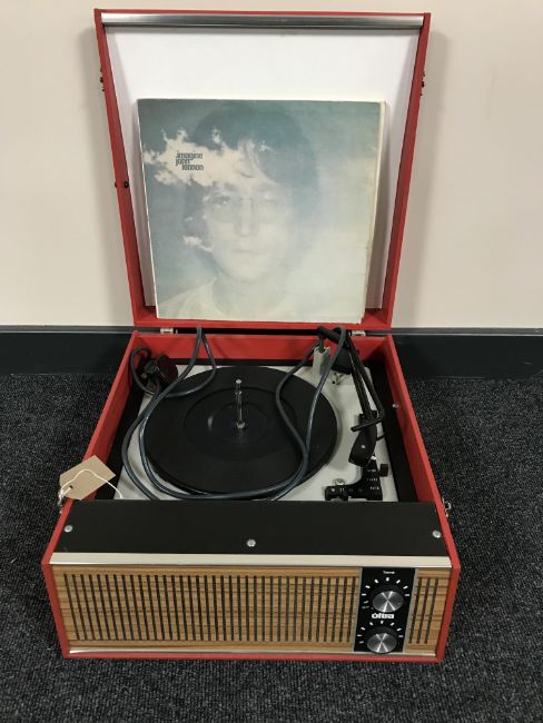A mid 20th century Ultra table top record player, two LPs The Greatest Hits of The Beatles and Imagine by John Lennon