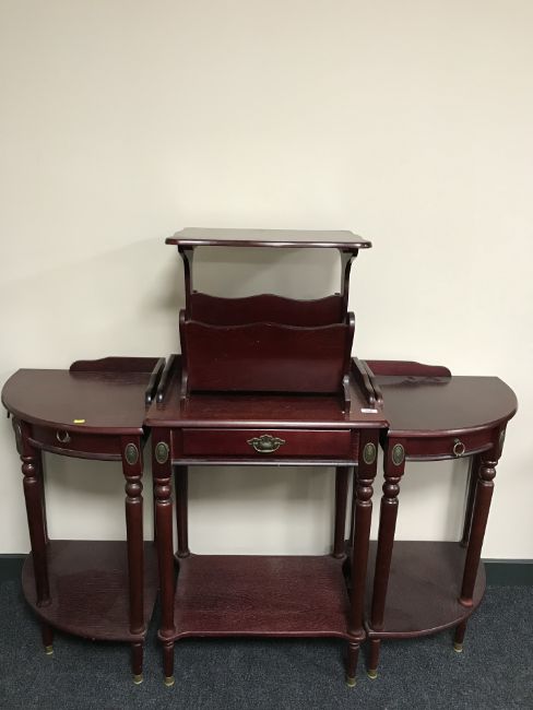 A mahogany two tier telephone table, matching corner tables and a mag rack