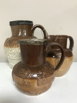 Three Royal Doulton stone ware jugs one with a silver rim