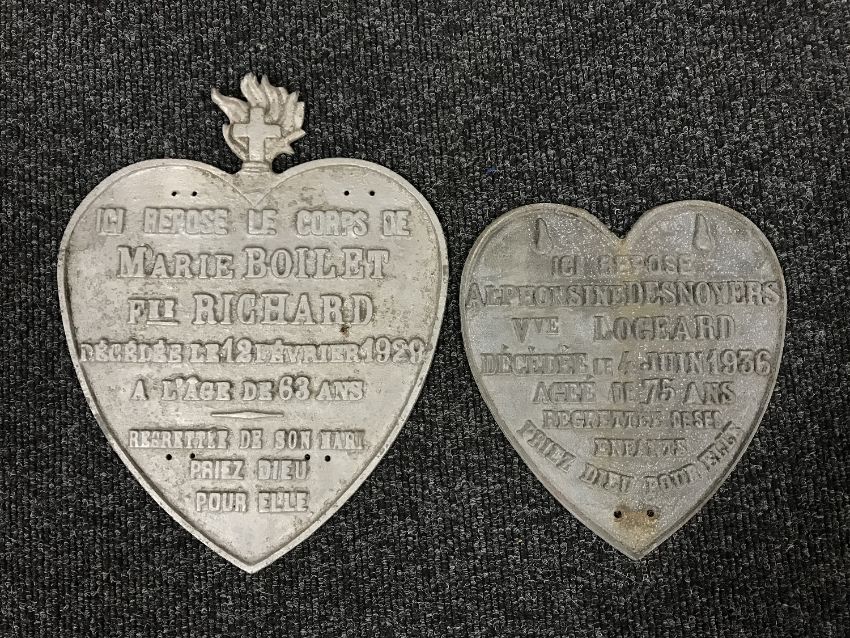Two cast metal heart shaped French plaques dated 1928 and 1936