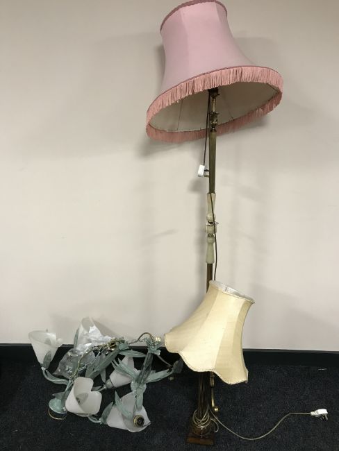 A brass and onyx lamp and shade, table lamp and two metal light fittings