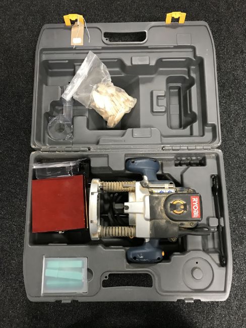 A cased Ryobi router with router bits