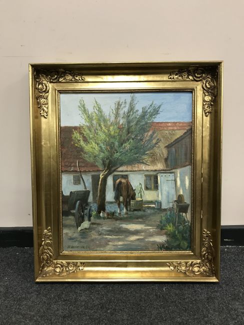 Continental school : A horse drinking by a barrel, oil on canvas, 44 cm x 54 cm, indistinctly signed, framed