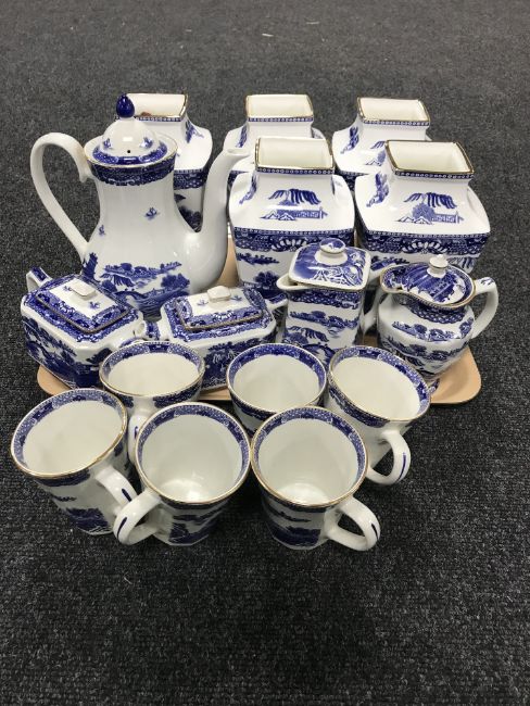 A tray of seventeen pieces of Ringtons willow pattern china - teapots, vases, cups etc