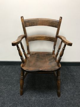 An antique pine kitchen armchair