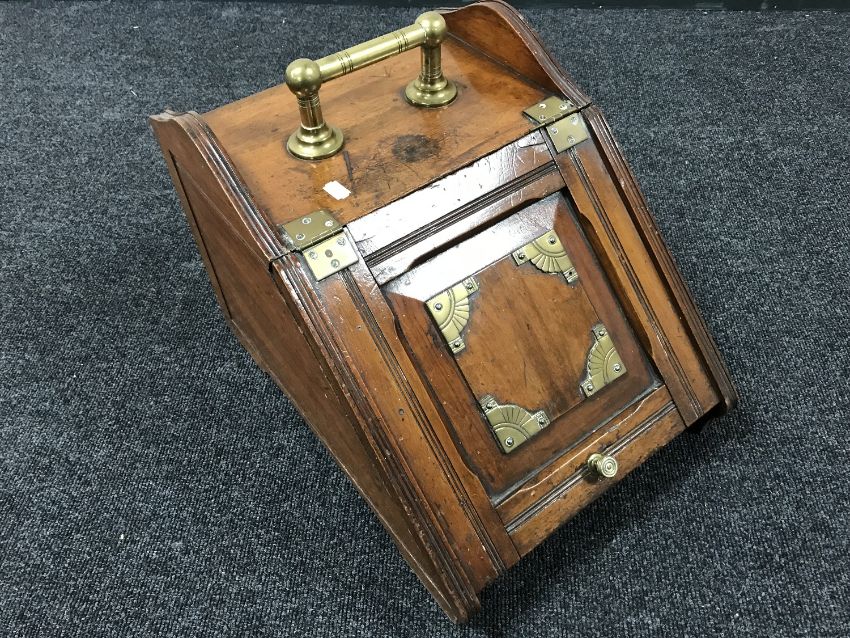 An early 20th century mahogany coal receiver with liner containing leather horse strap with bit