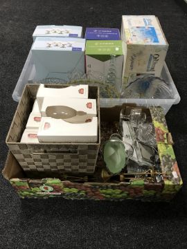 Two boxes of assorted glass ware including two sets of four Villeroy & Bosch fruit bowls, Viners casserole set, Orchard punch bowl, trinket sets, Spanish sword etc