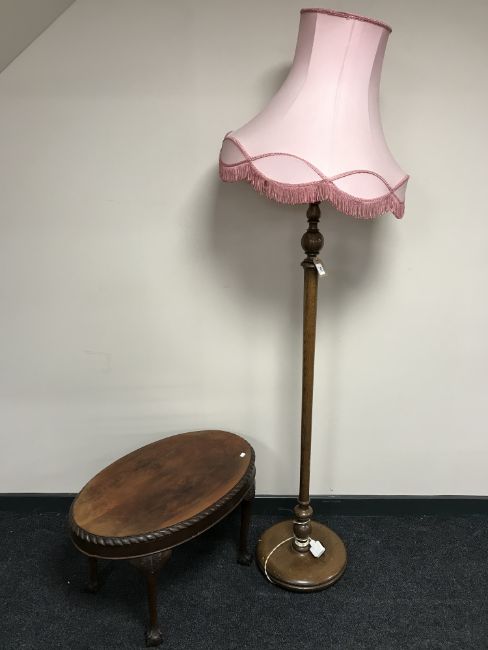 A mahogany coffee table and an oak standard lamp and shade
