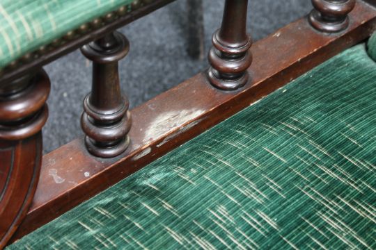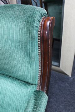Frame with typical scuffs, scratches and watermarks. Seat with one small moth-damaged patch. Otherwise generally in good order. The chair does not appear to have had castors. This measures 90cm high, 69cm wide and 95cm deep.