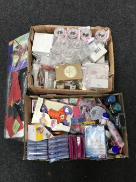 Two boxes of wedding invitations, sweet jars, confetti etc and a box of toys, cosmetics etc