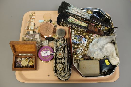 A tray of assorted costume jewellery, hand fans, trinket box etc