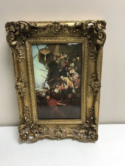 An ornate gilt framed ceramic panel depicting soldiers leaving a ship